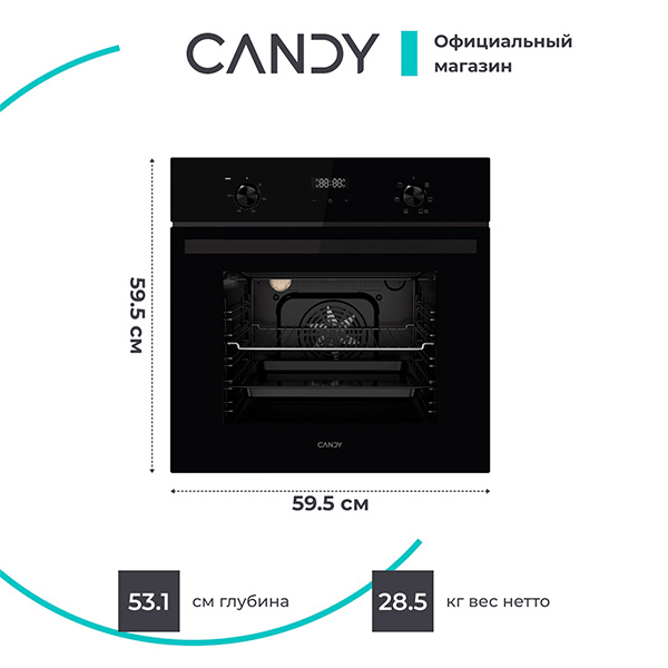 Объем духовки: 63 л / Ширина встраивания: 56,5 см / Кол-во режимов приготовления: 4 / Максимальная температура духовки: 250 °C / Тип очистки духовки: Традиционная очистка / Телескопические направляющие: Нет / Тип управления: Электронный / Цвет корпуса: Черный / Дисплей: Нет / Габариты (В х Ш х Г): 59.5 х 59.5 х 50 см / Габариты встраивания (Ш х В х Г): 60 х 56.5 х 49.5 см