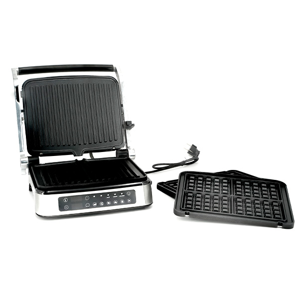 Количество панелей: 2 шт / Тип управления: Сенсорное / Тип установки: Настольный / Материал корпуса: Нержавеющая сталь / Тип: Грили / Расположение нагревательного элемента: Верхнее / нижнее