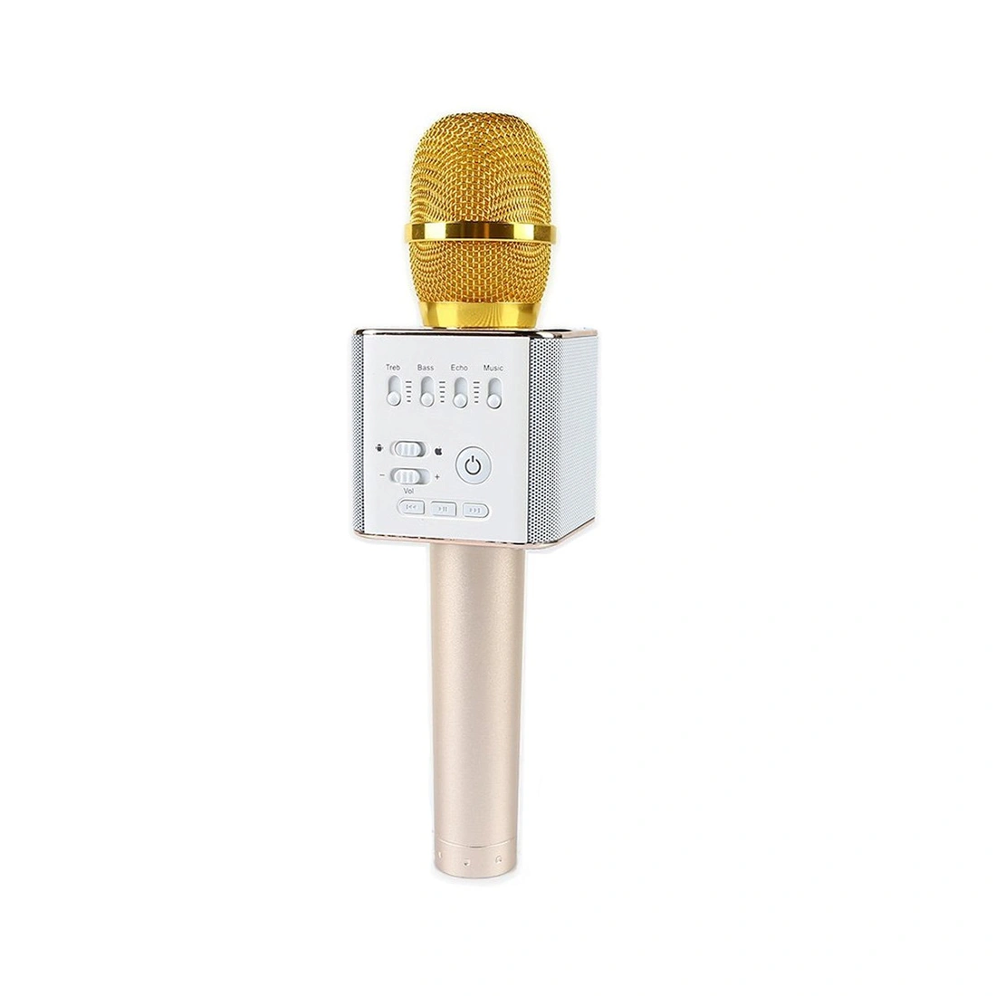 Блютуз караоке микрофон Q9 Золотой Портативный караоке микрофон - это новая, ставшая популярной модель функциональной колонки и беспроводного микрофона в одном корпусе. Модель имеет microUSB и USB разъёмы, позволяющие подключить внешний накопитель с песнями, и управлять ими прямо с панели микрофона, а также разъём для TF карты. Беспроводной микрофон оснащен встроенной панелью, позволяющей переключать, останавливать, воспроизводить, настраивать эквалайзер и громкость музыки или голоса. Технические характеристики: Динамик: 5Вт*2 Частота: 30Гц - 20КГц Сопротивление: 2*4 Ω Режим передачи: Bluetooth Аккумулятор: Литиевый 2600 мАч Вход: 5В / 0.8 А Время подзарядки: 3-4 часа Длительность работы: 11-14 часов В комплекте: Микрофон - 1 шт. USB зарядный кабель - 1 шт. Audio кабель - 1 шт.