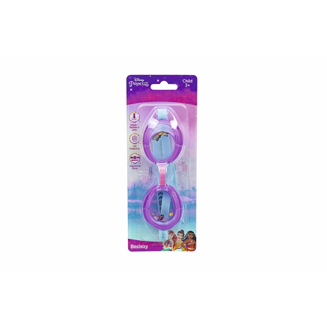 Очки для плавания Essential, BESTWAY, 9102O, Пластик, 3+, Disney Princess, Фиолетово-голубые, БлистерПодарите своему ребенку удовольствие от погружения под воду с его любимыми очками Disney® Princess Essential! Очки для плавания, идеально подходящие для детей от 3 лет, украшены изображениями смелых и добрых принцесс Диснея. Ударопрочные линзы с УФ-защитой: Очки Disney Princess Essential имеют ударопрочные линзы из поликарбоната с УФ-защитным покрытием, которые защищают глаза ваших детей от солнца, а также выдерживают обычные удары и падения на террасу бассейна. Удобная посадка: Благодаря мягким удобным наглазникам, регулируемой переносице и силиконовому ремешку эти невероятно забавные очки для плавания позволяют легко подобрать правильную посадку, чтобы ваш ребенок мог дольше наслаждаться плаванием, не прибегая к постоянным регулировкам. Каждый солнечный день будет наполнен брызгами и смехом благодаря очкам для плавания Disney Princess Essential! Ударопрочные линзы из поликарбоната с защитным покрытием от ультрафиолетовых лучей Мягкие, удобные наглазники Регулируемая переносица и силиконовый ремешок Не содержащие латекс материалы В комплект входит: 1 пара очков