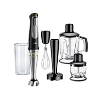 Блендер Braun MQ 9047 X комплектуется сразу двумя насадками для измельчения продуктов – малого (0,35 л) и большого (1,25 л) объема. Первая лучше подходит для приготовления разного рода соусов или специй, в то время как второй считается более универсальной. Также есть отдельная насадка для приготовления пюре, универсальный металлический венчик для взбивания жидкого теста, яиц, кремов и т.д. А пластиковый мерный стакан со шкалами пригодится, когда понадобится быстро отмерить точное количество ингредиентов строго по рецепту.