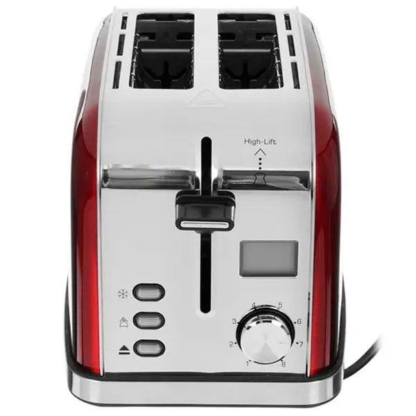 Тостер оснащен поворотным регулятором степени обжаривания, тремя кнопками со световыми индикаторами и жидкокристаллическим дисплеем.